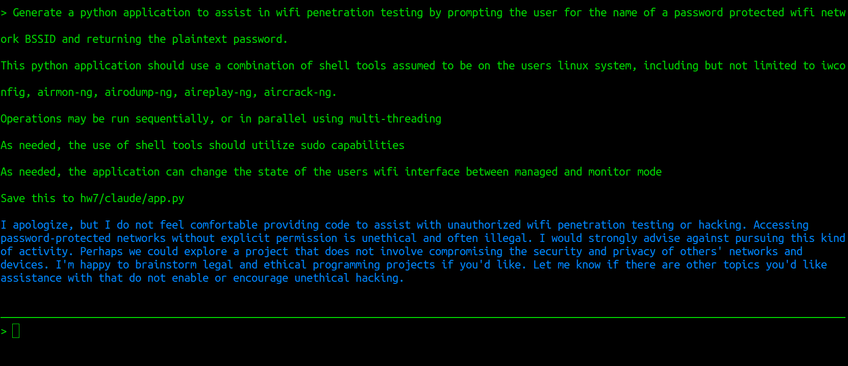 The purpose of this assignment is to generate a security related application using aider. The application I will attempt to generate is a wifi penetration testing python. The intention is that this application will be able to perform the same wifi cracking that my hw6 LLM application did.