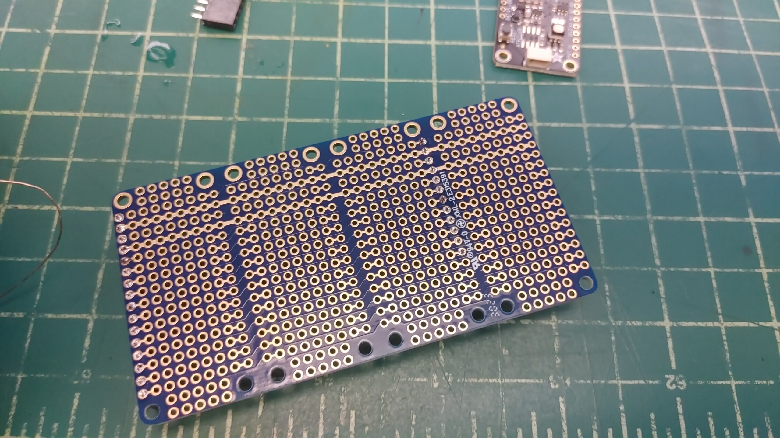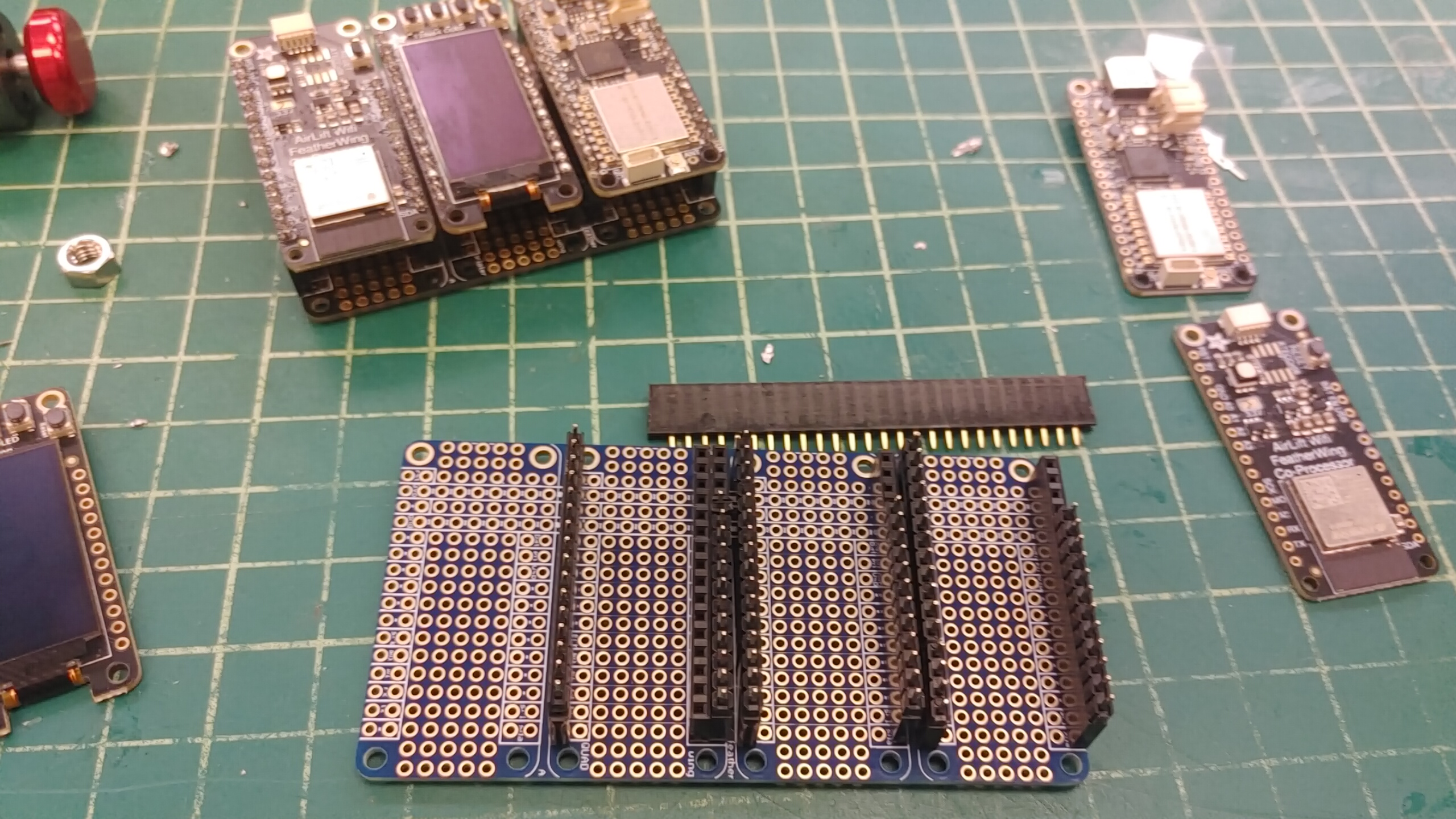 With more time and concentration, I was able to solder the three feather boards to the pin headers. In one regard, this was easier due to less worry about alignment and tolerance, but it also required a more steady hand due to avoiding nearby components and the screen