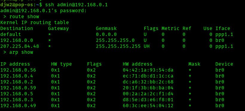 The arp table shows us the IP devices and their associated MAC addresses, and we confirm that none of the MAC addresses associated with the pitap appear here.