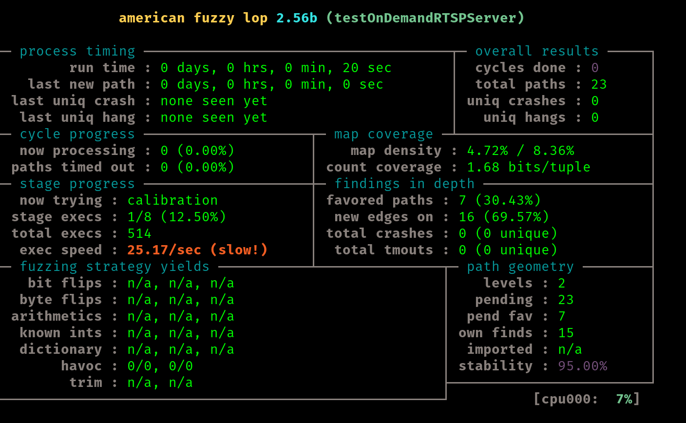 afl-fuzz -d -i $AFLNET/tutorials/live555/in-rtsp -o out-live555 -N tcp://127.0.0.1/8554 -x $AFLNET/tutorials/live555/rtsp.dict -P RTSP -D 10000 -q 3 -s 3 -E -K -R ./testOnDemandRTSPServer 8554