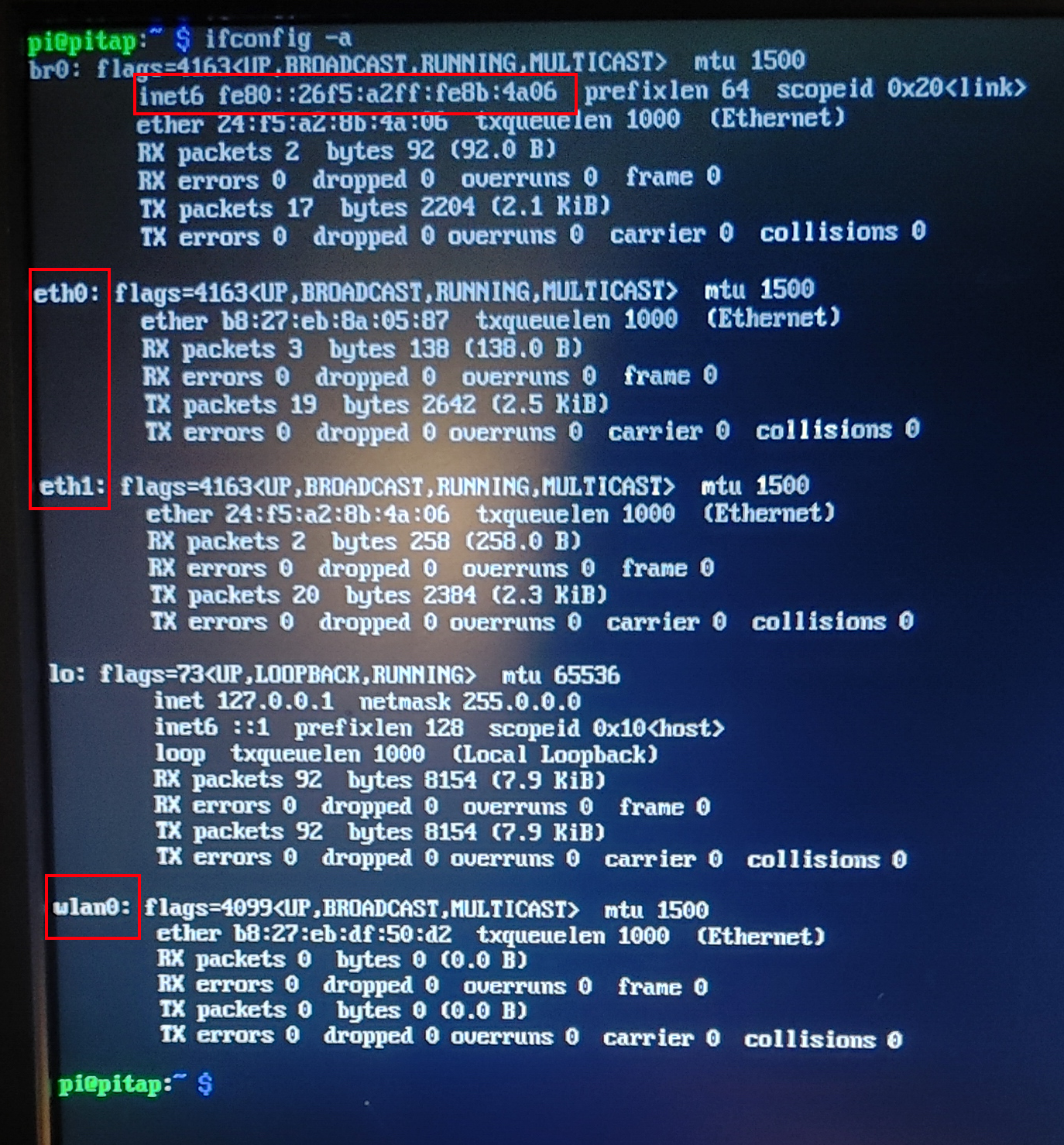 shows us the pitap does not have any assigned IP addresses on our network. Aside from a link local Ipv6 assigned to br0