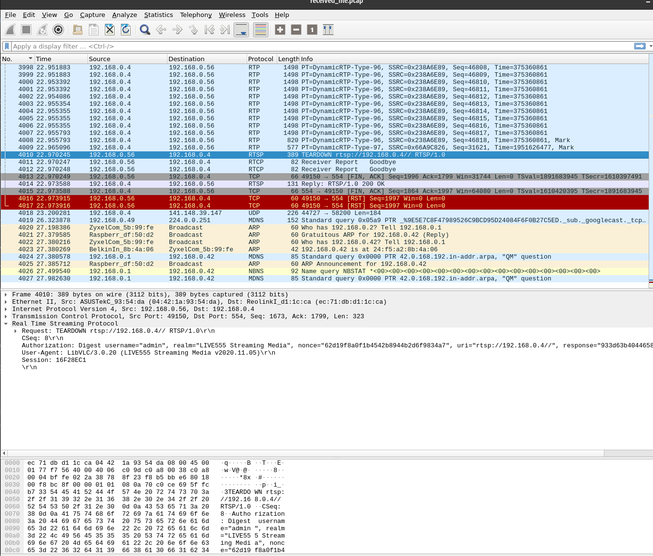 End of stream - This looks ok too, we see the teardown of the RTSP stream. It also seems that APR packets from the pitap wireless interface are making their way back to br0